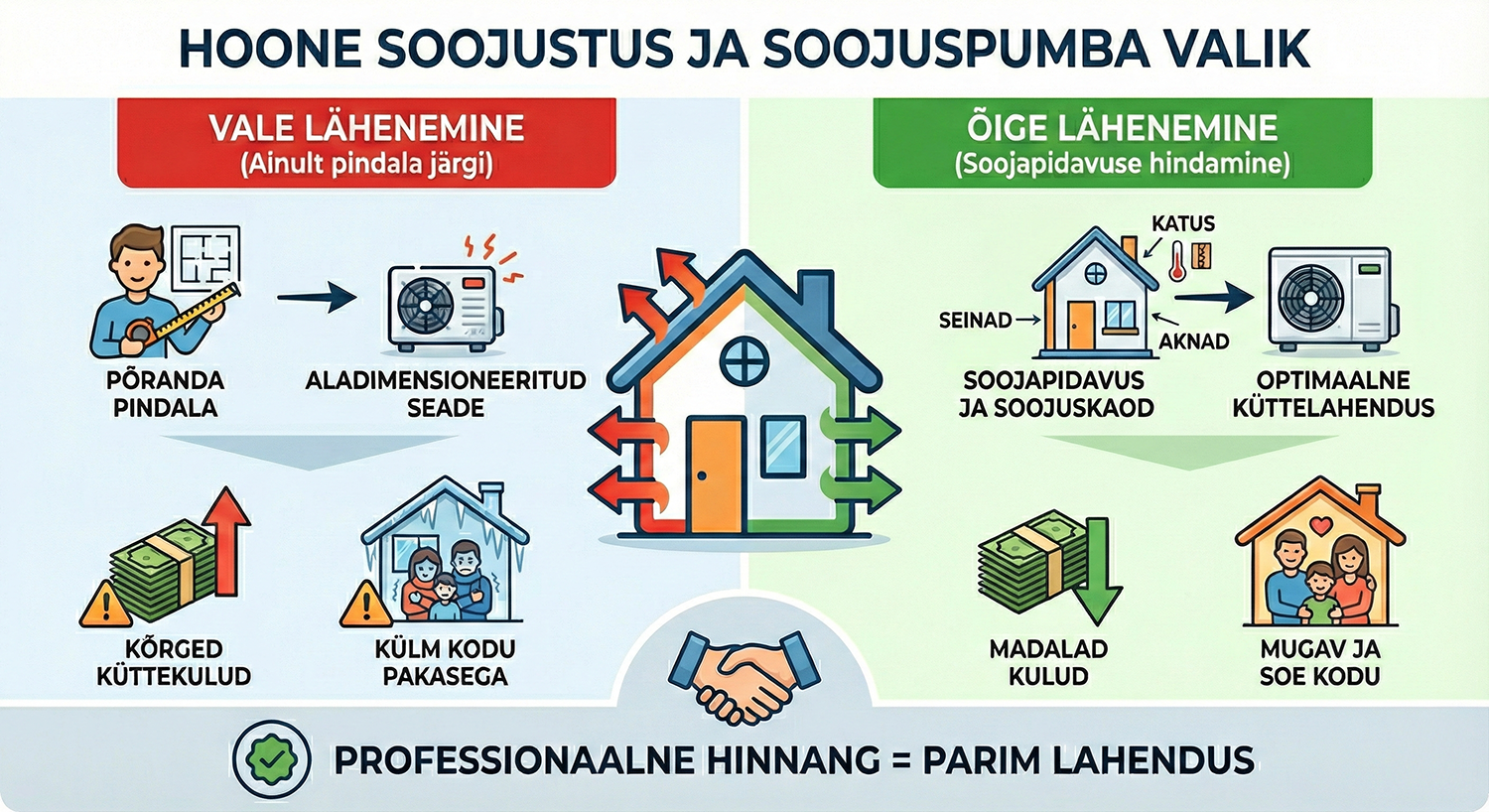 Professionaalsel müügi- ja paigaldusfirmal on olemas oskused, kuidas hoone soojapidavust ja soojuskadusid hinnata (arvutada) ning lähtuvalt sellest õiget küttelahendust pakkuda.
